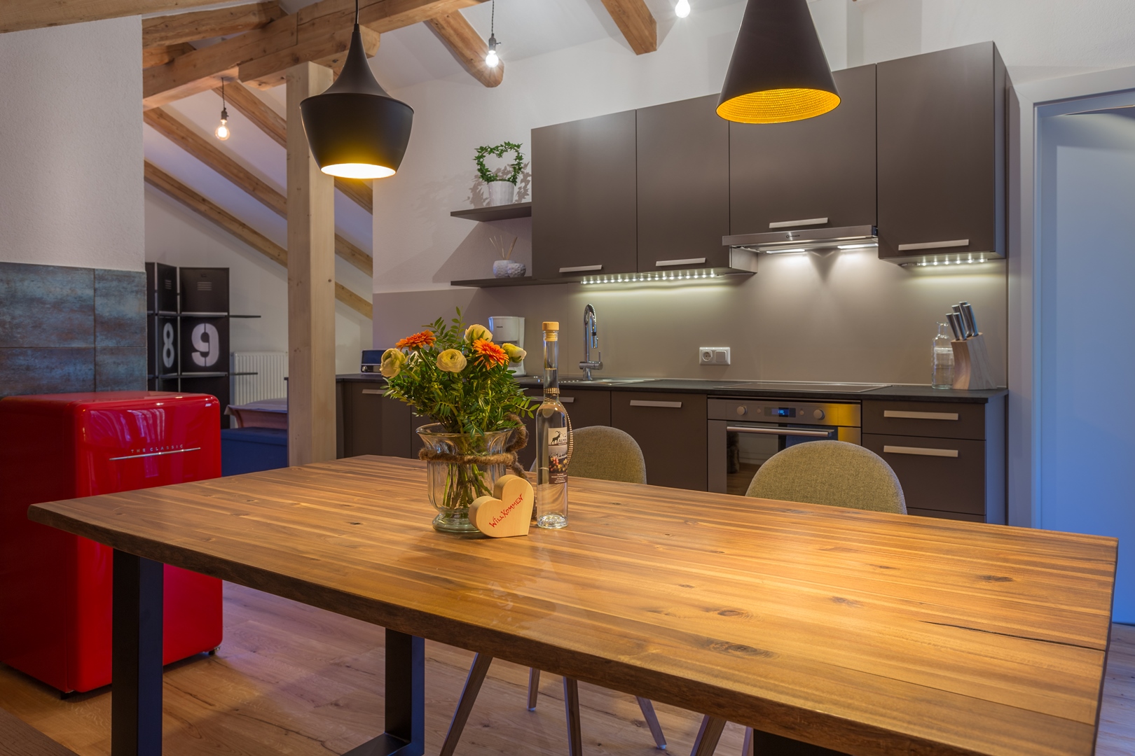 - Extravaganter Loftstyle im Wohn- und Küchenbereich mit großem Esstisch, Spül-/Kaffeemaschine,
