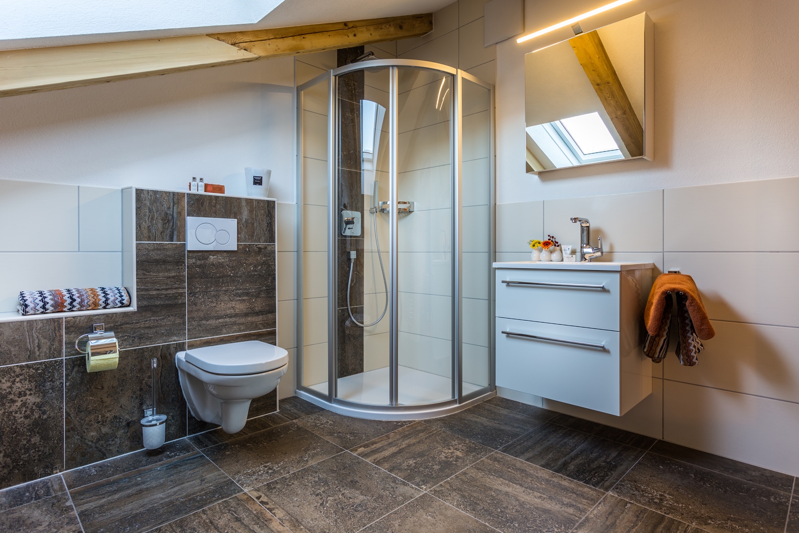- modernes Bad mit Dusche und WC, Fön, sowie Waschmaschine und Trockner