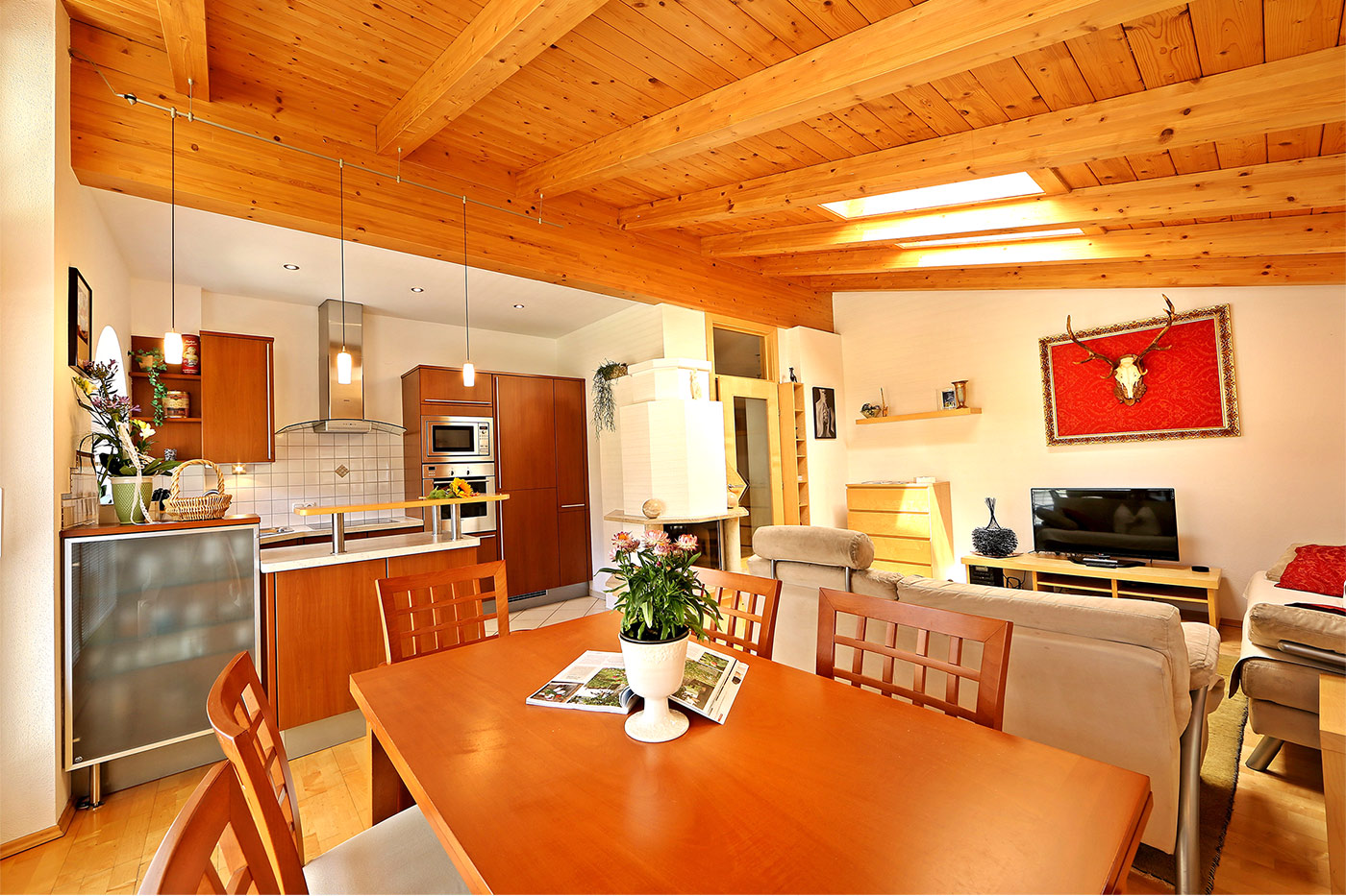 - moderne 30 m² Wohnküche mit großem Esstisch, Spül-/Kaffeemaschine,